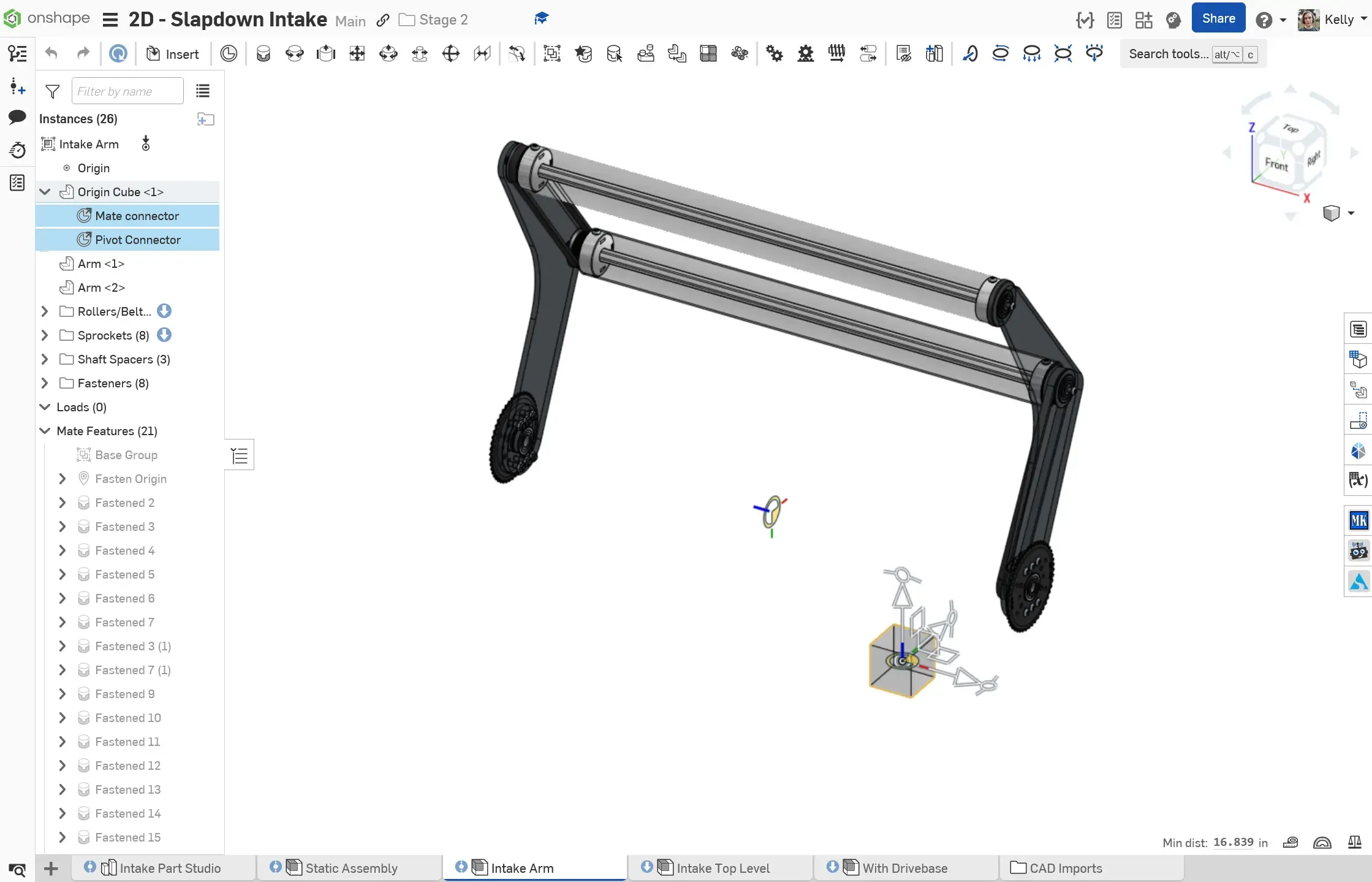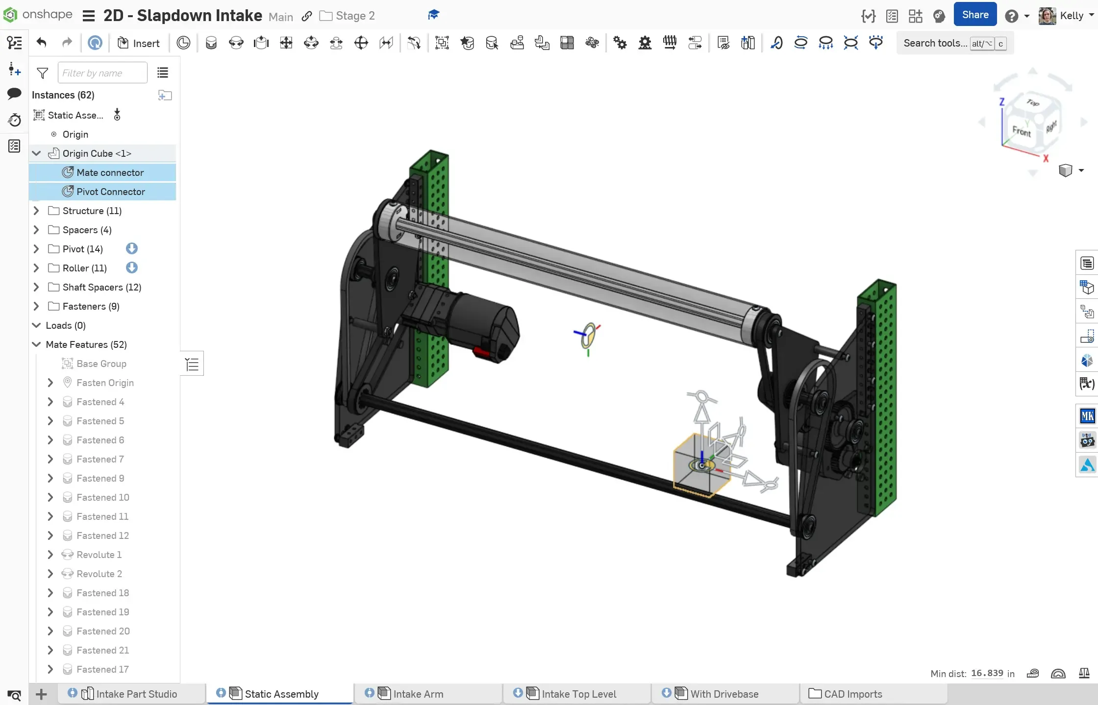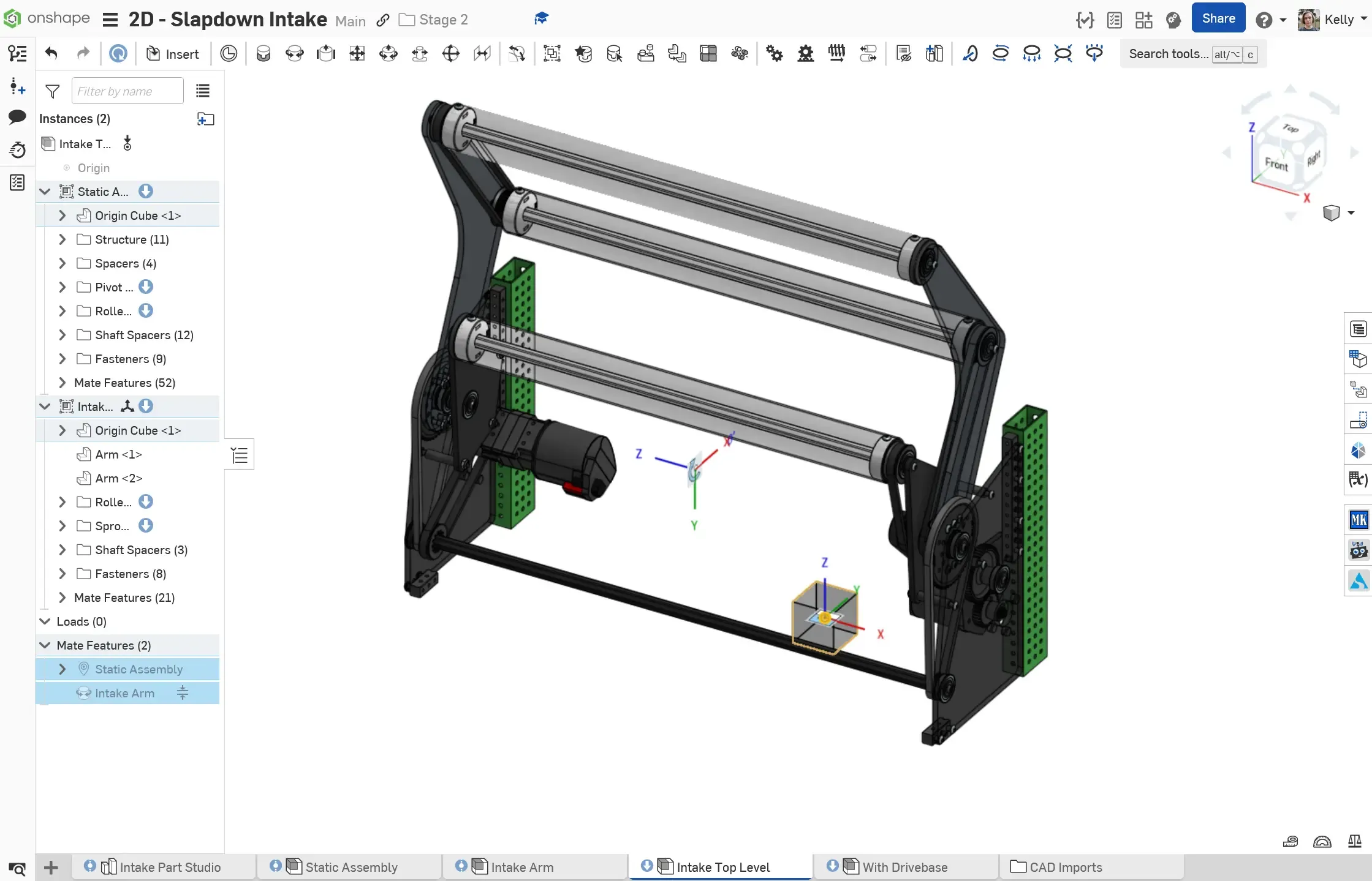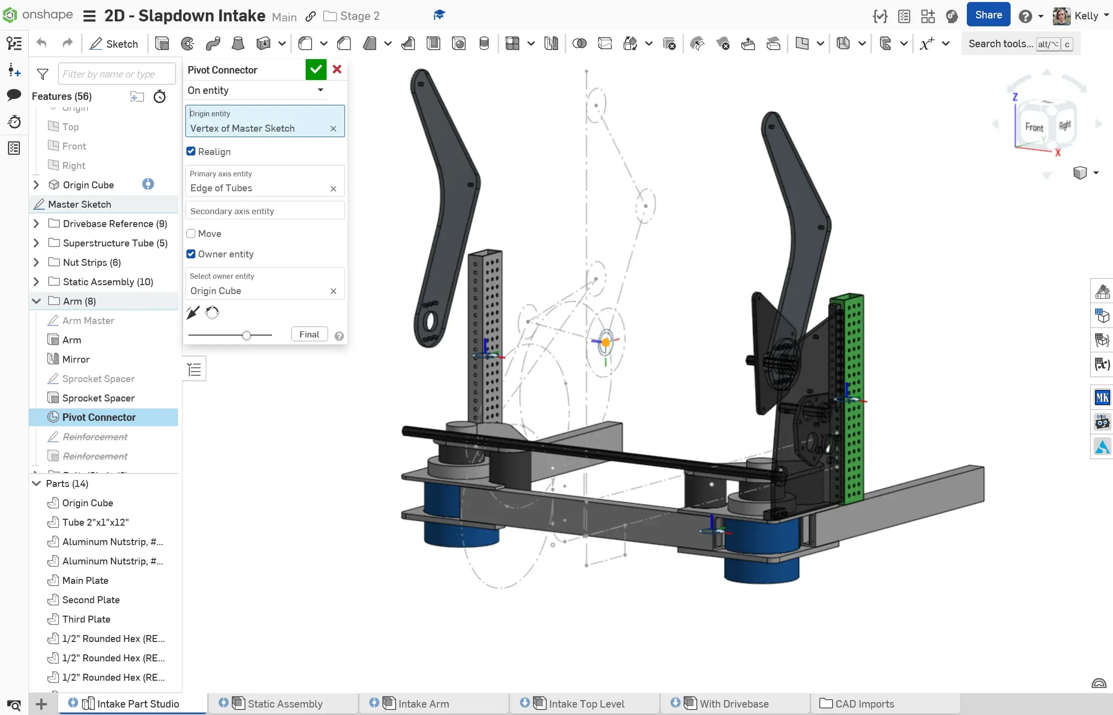 Section titled “Example: Stage 2C - Slapdown Intake”The Stage 2C Slapdown Intake is a subsystem with a static portion and a pivoting portion. An extra mate connector is added for the pivot on the main layout sketch, owned by the origin cube.