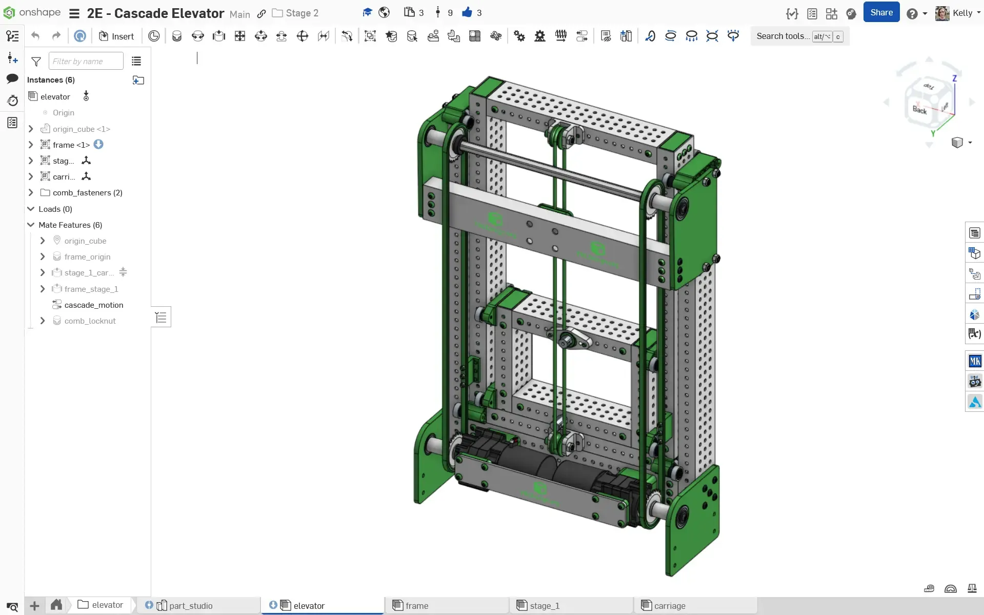 Section titled “Example: Stage 2D - Cascade Elevator”The Stage 2D Cascade Elevator is a subsystem with a static portion and two subassemblies that slide linearly. This contains a part studio, a static frame/gearbox assembly, assemblies for the first stage and carriage, and a top-level assembly combining the 3 subassemblies with slider mates.