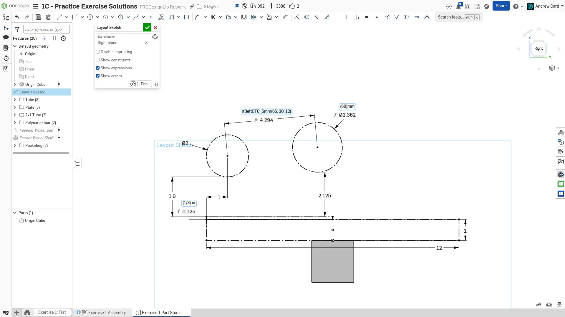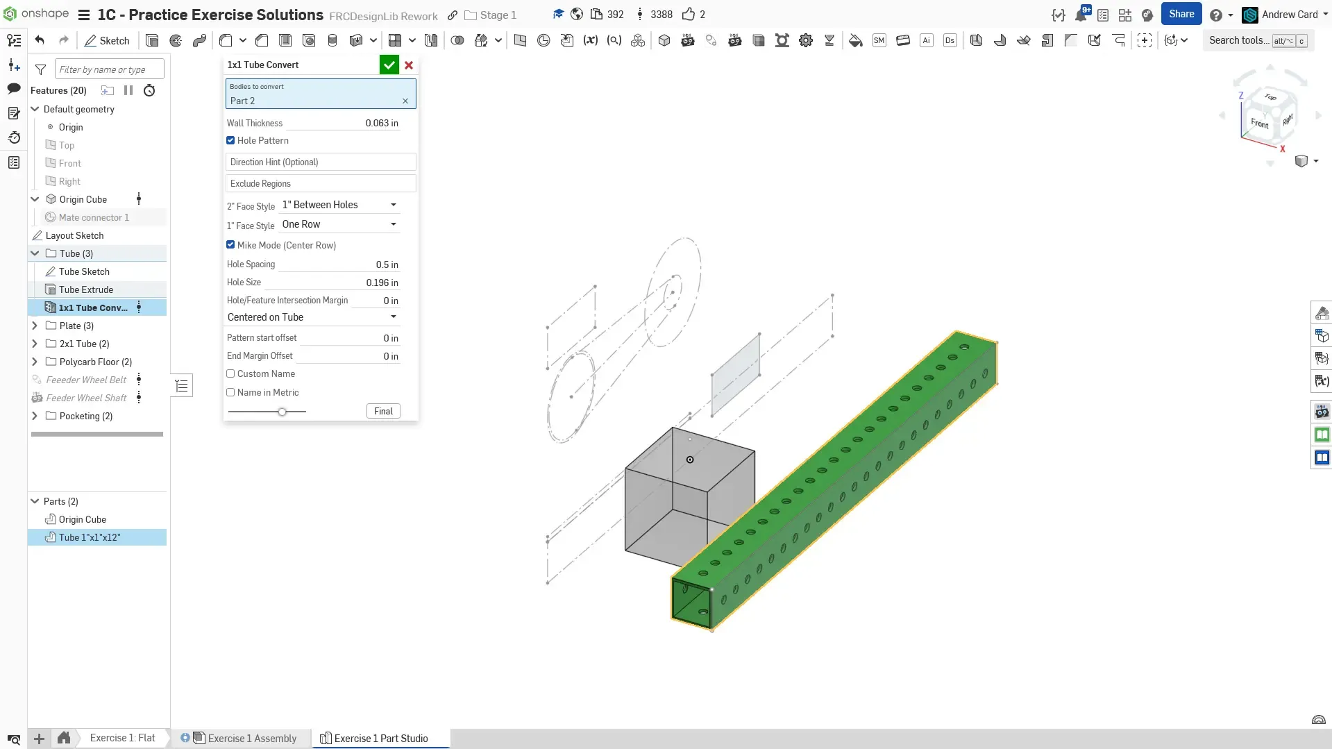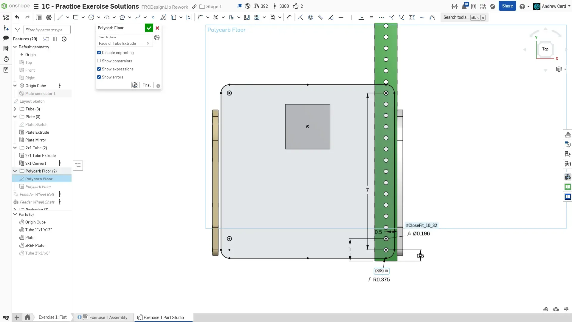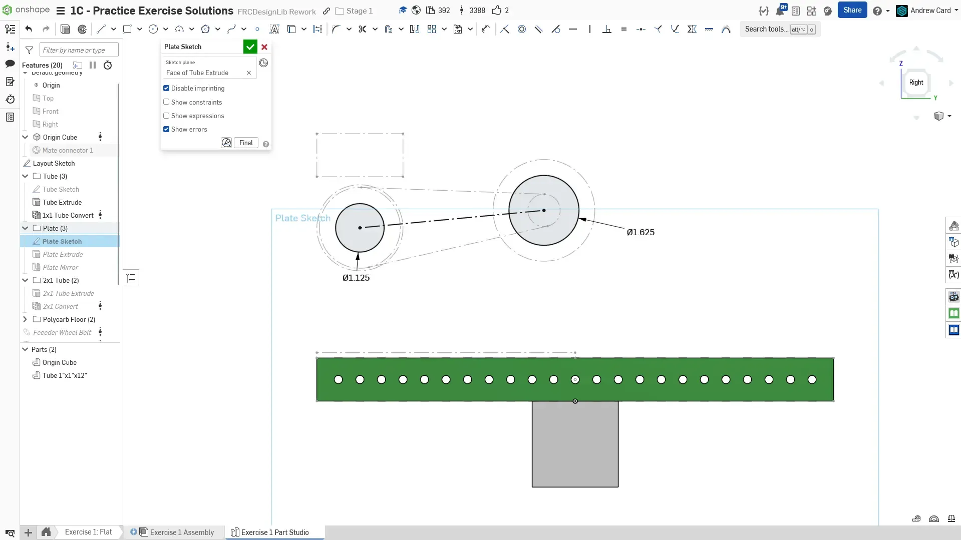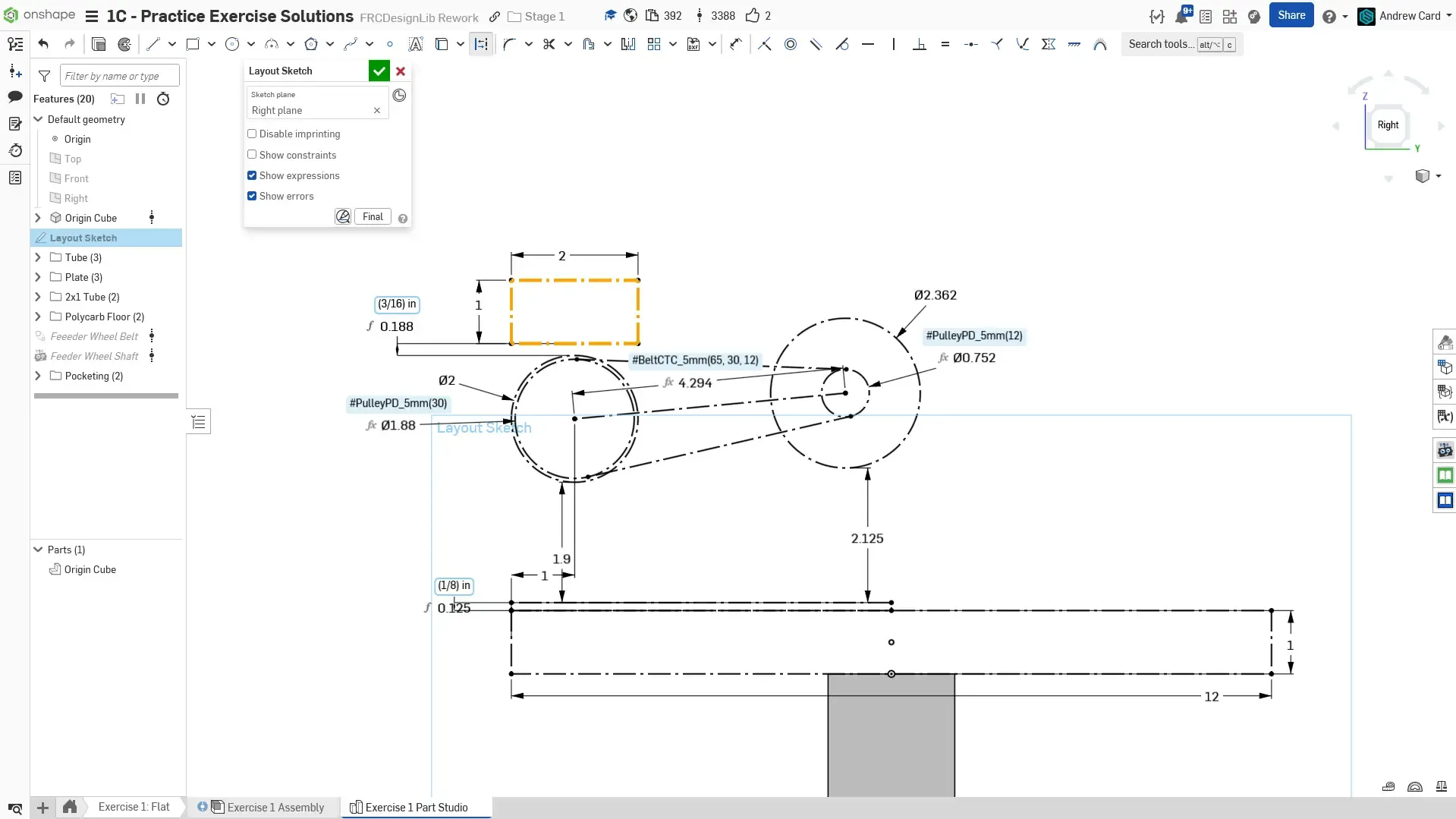 Try playing around to get a feel for what things are and aren’t parametric in exercise 1. You can try changing things like the width, length, tube positions, or gear ratio. Which dimensions are easy to change and which are difficult? Which dimension changes cause rebuild or assembly error?