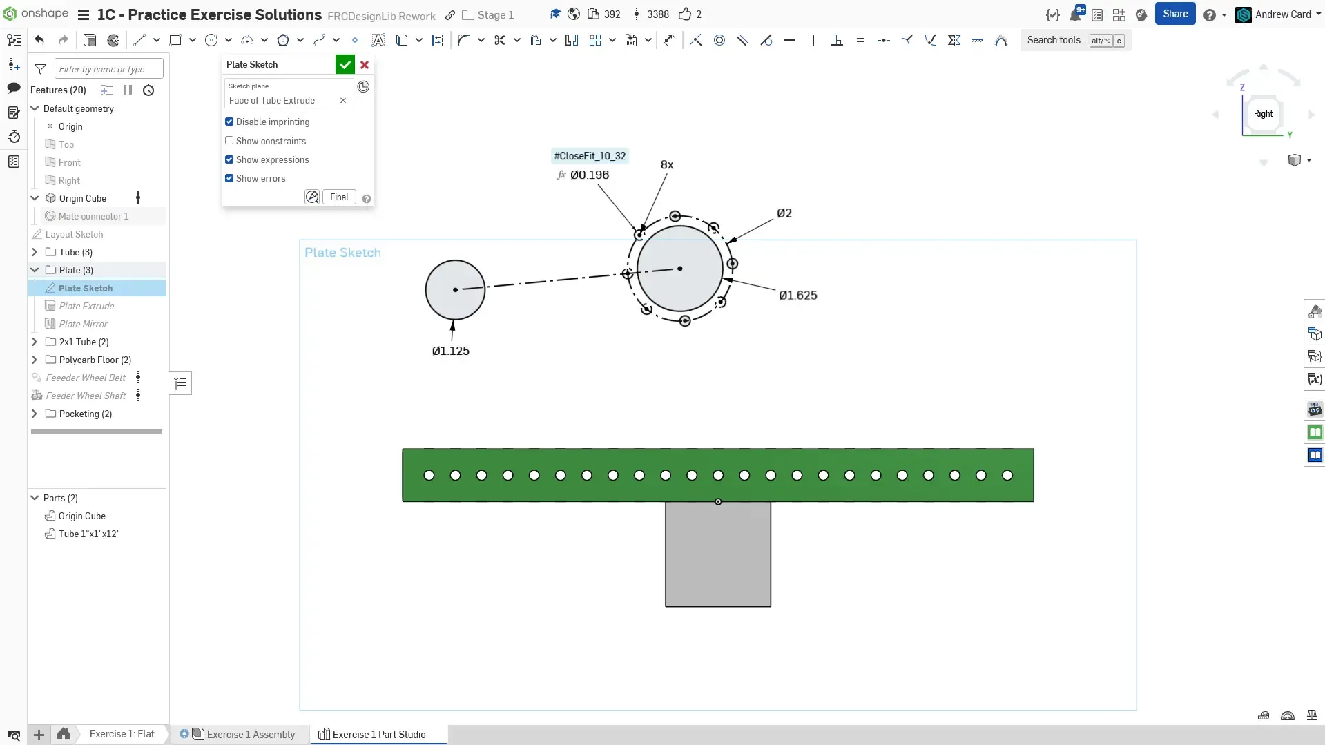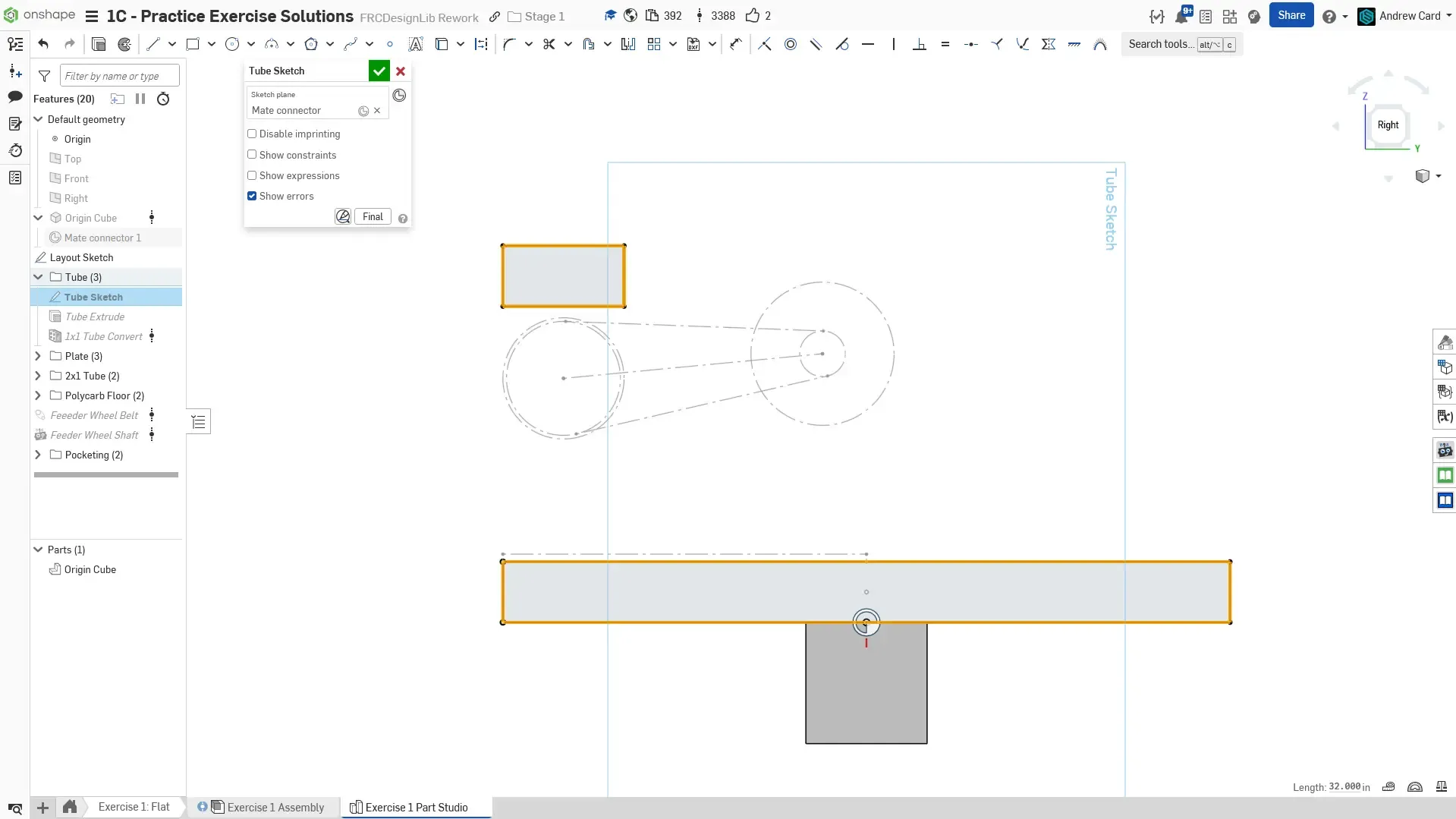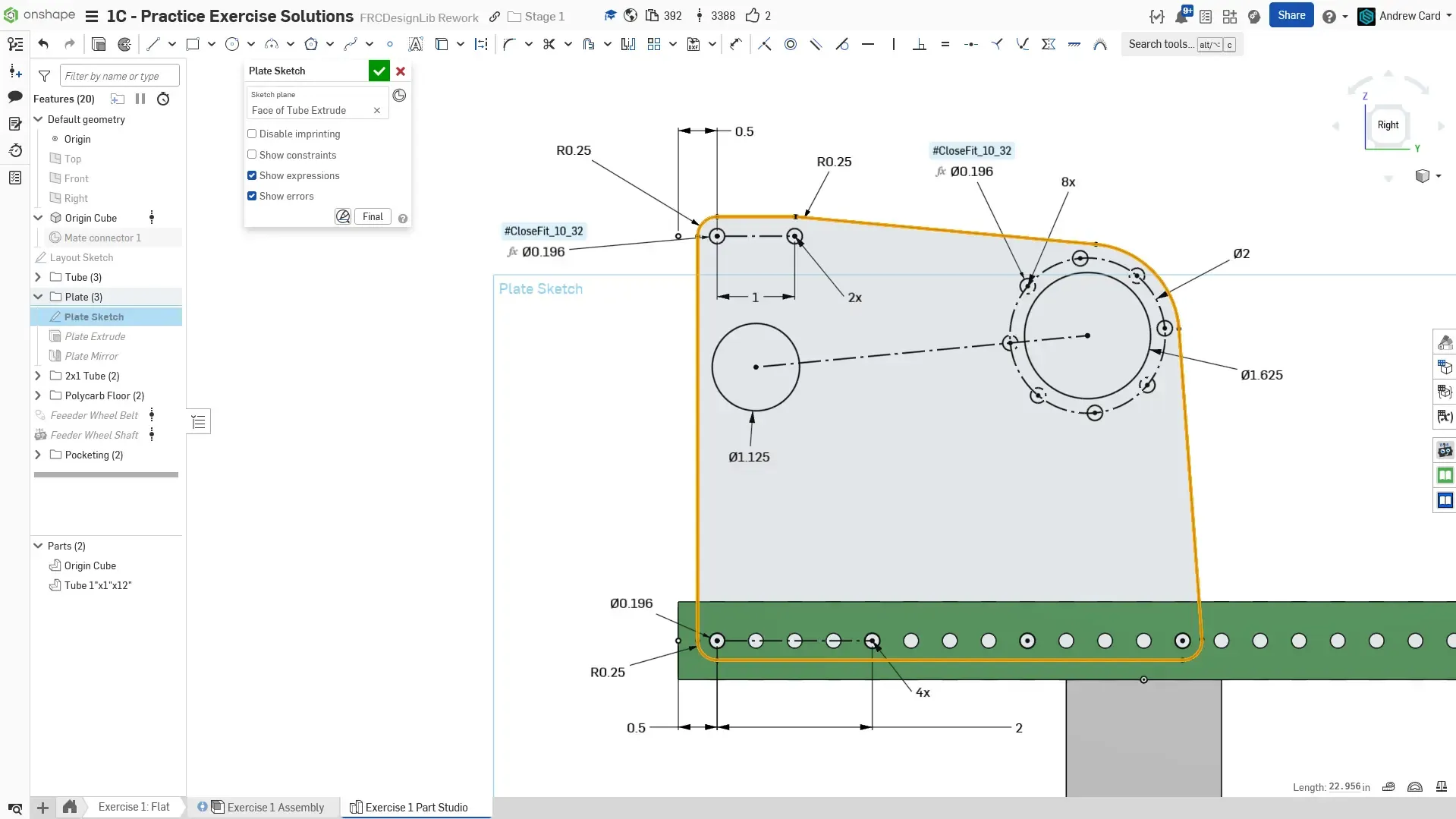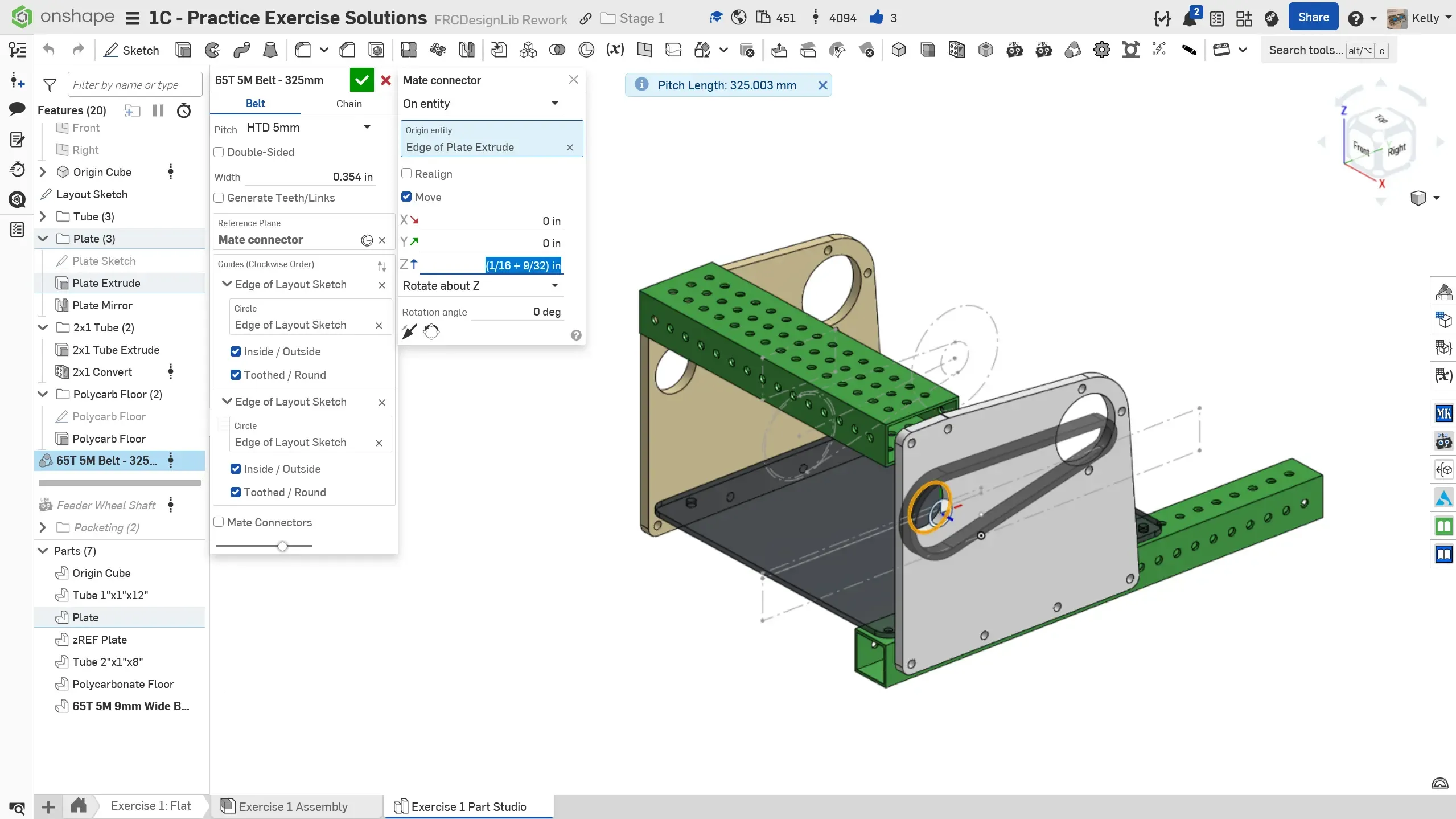 Try playing around to get a feel for what things are and aren’t parametric in exercise 1. You can try changing things like the width, length, tube positions, or gear ratio. Which dimensions are easy to change and which are difficult? Which dimension changes cause rebuild or assembly error?