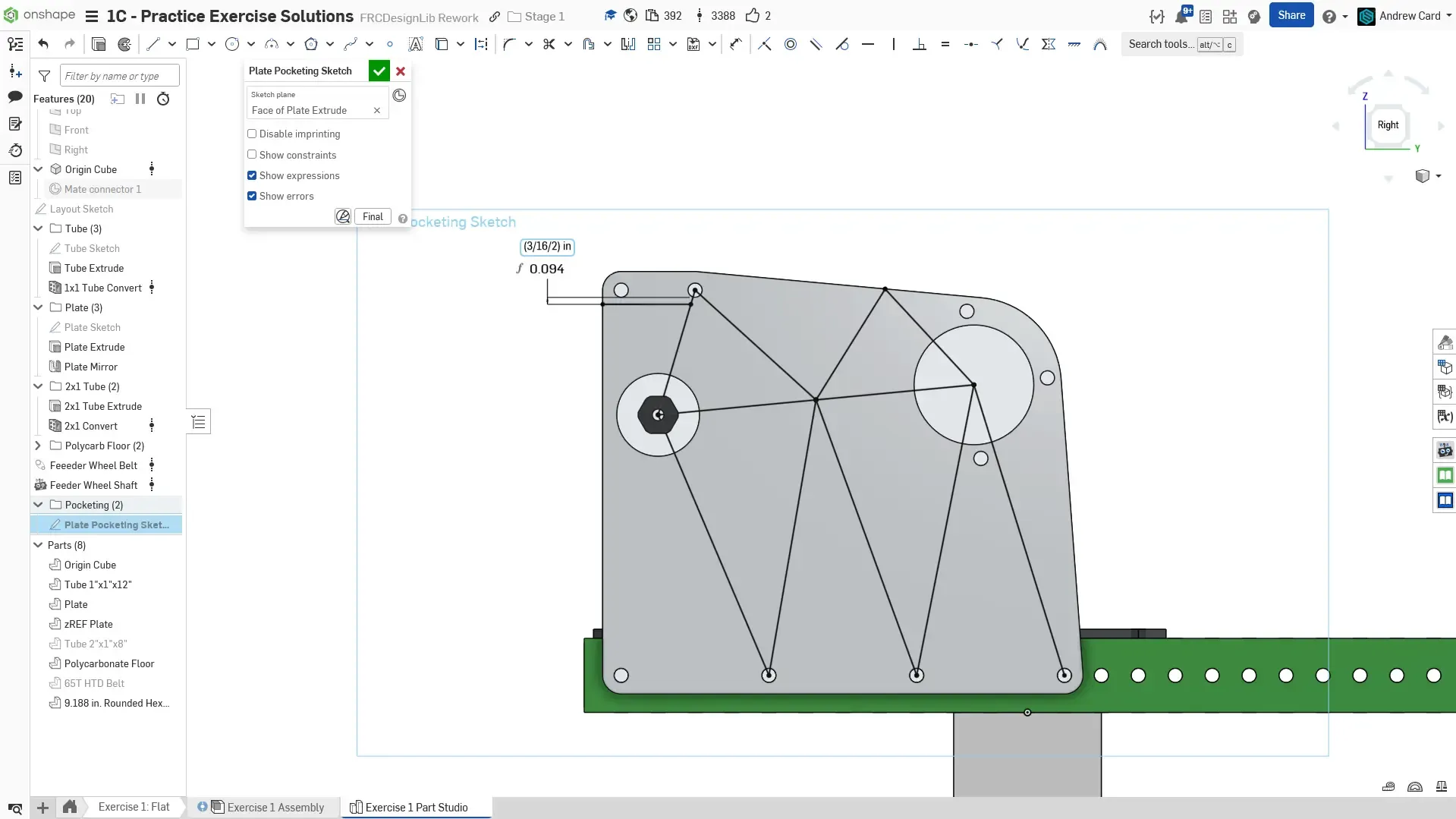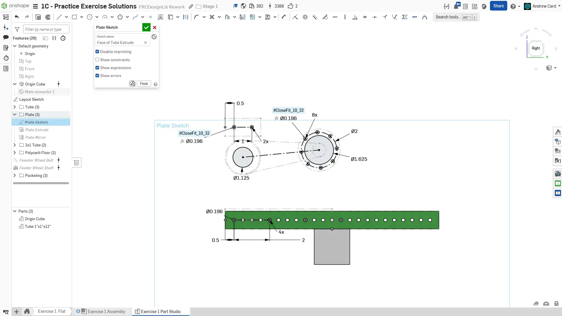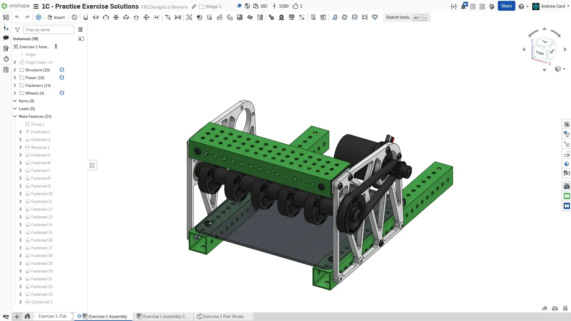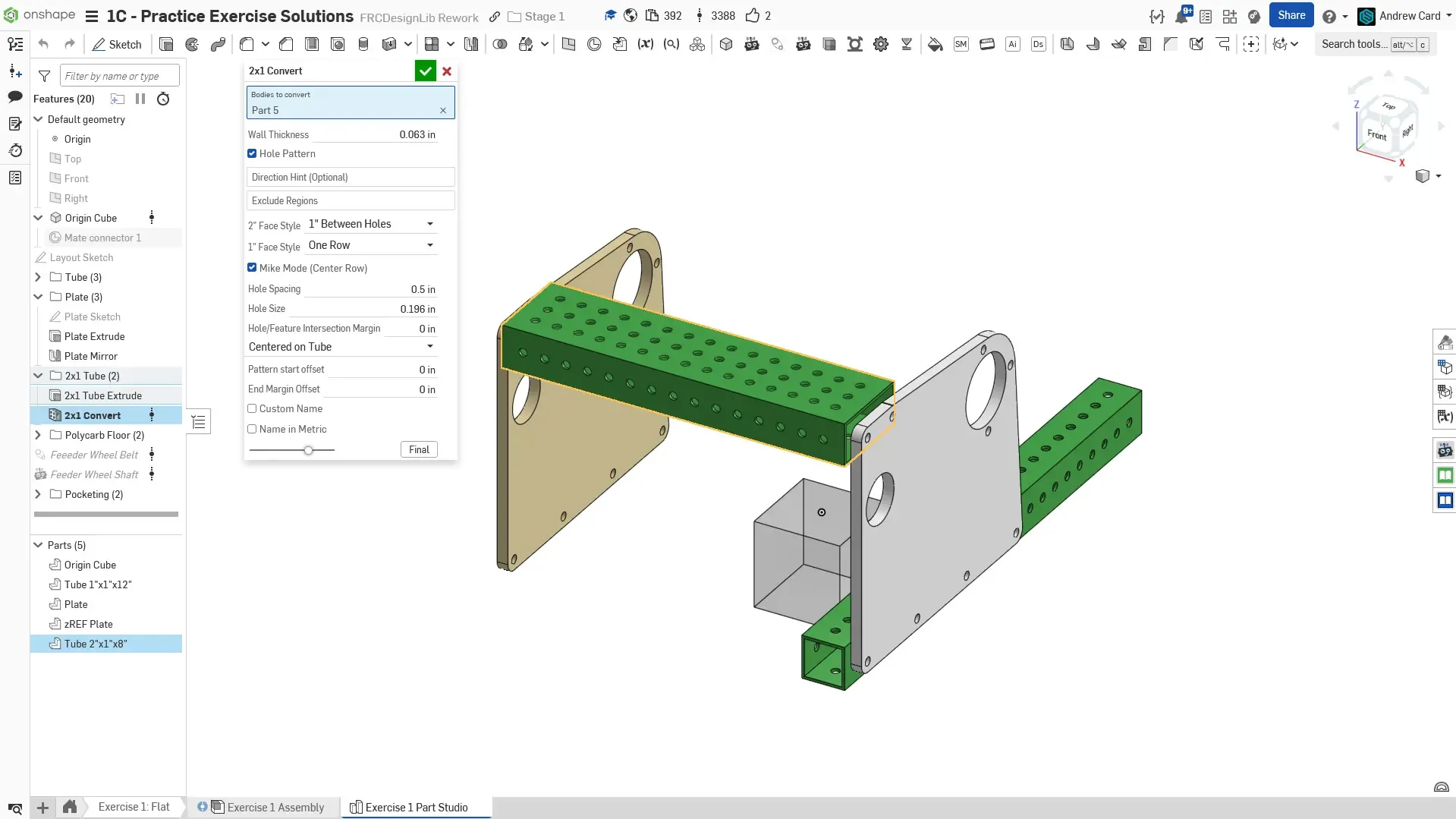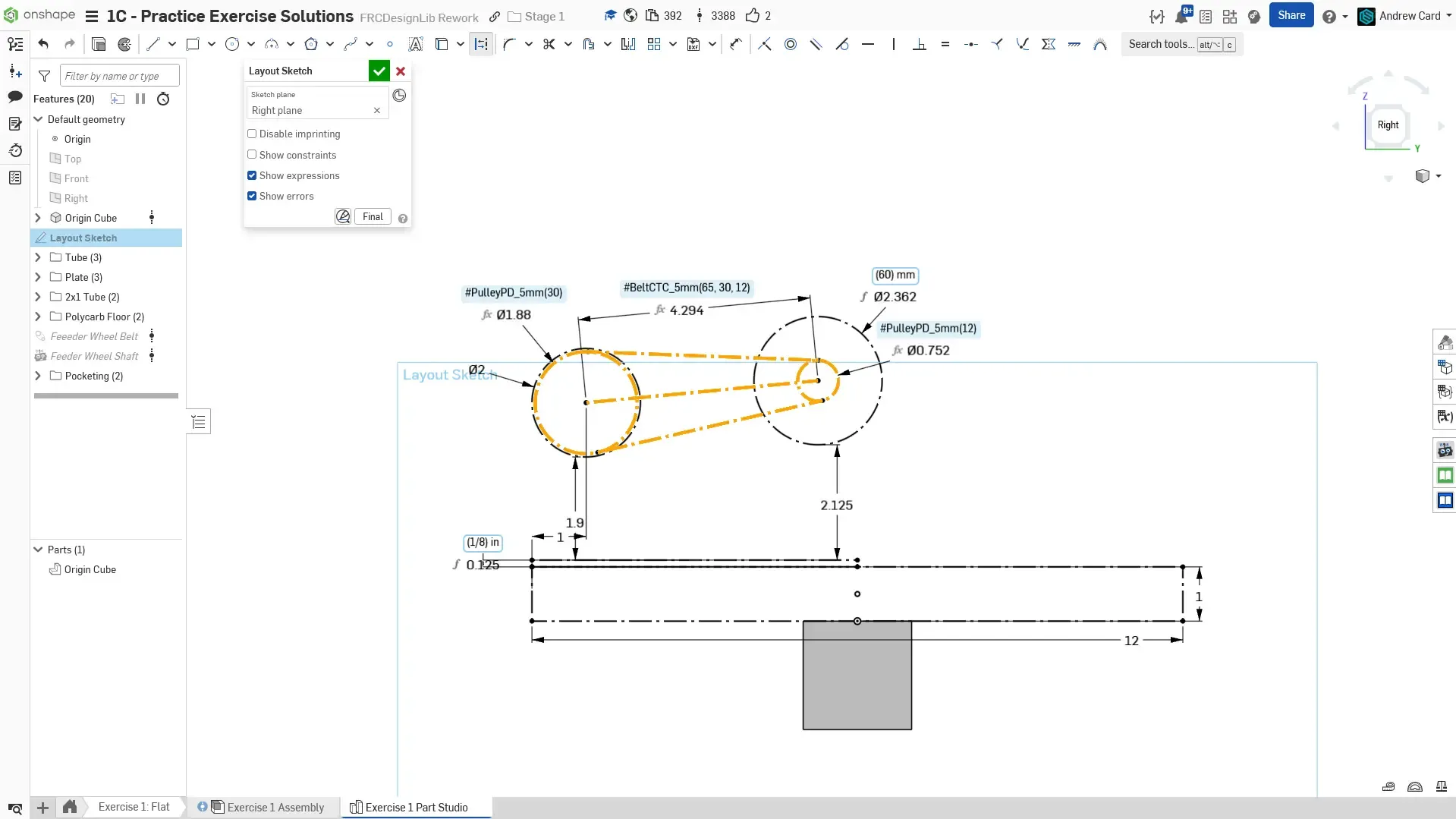 Try playing around to get a feel for what things are and aren’t parametric in exercise 1. You can try changing things like the width, length, tube positions, or gear ratio. Which dimensions are easy to change and which are difficult? Which dimension changes cause rebuild or assembly error?