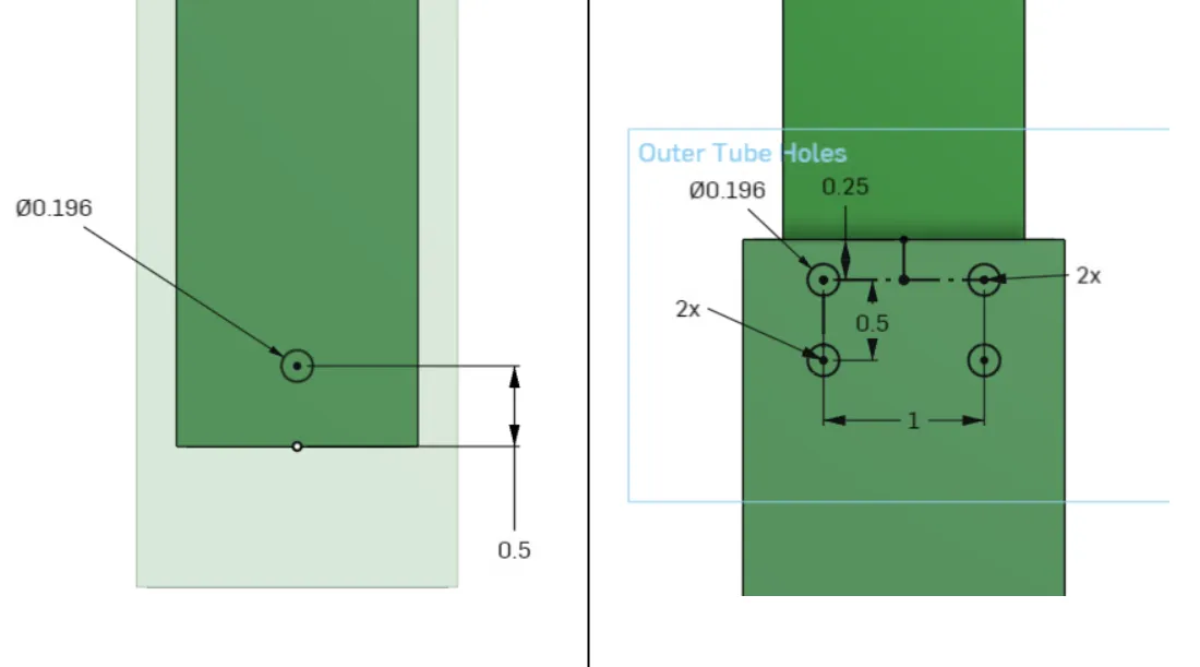 Add the holes for the WCP bearing blocks to the inner and outer tubes. The dimensions are from WCP’s documentation.