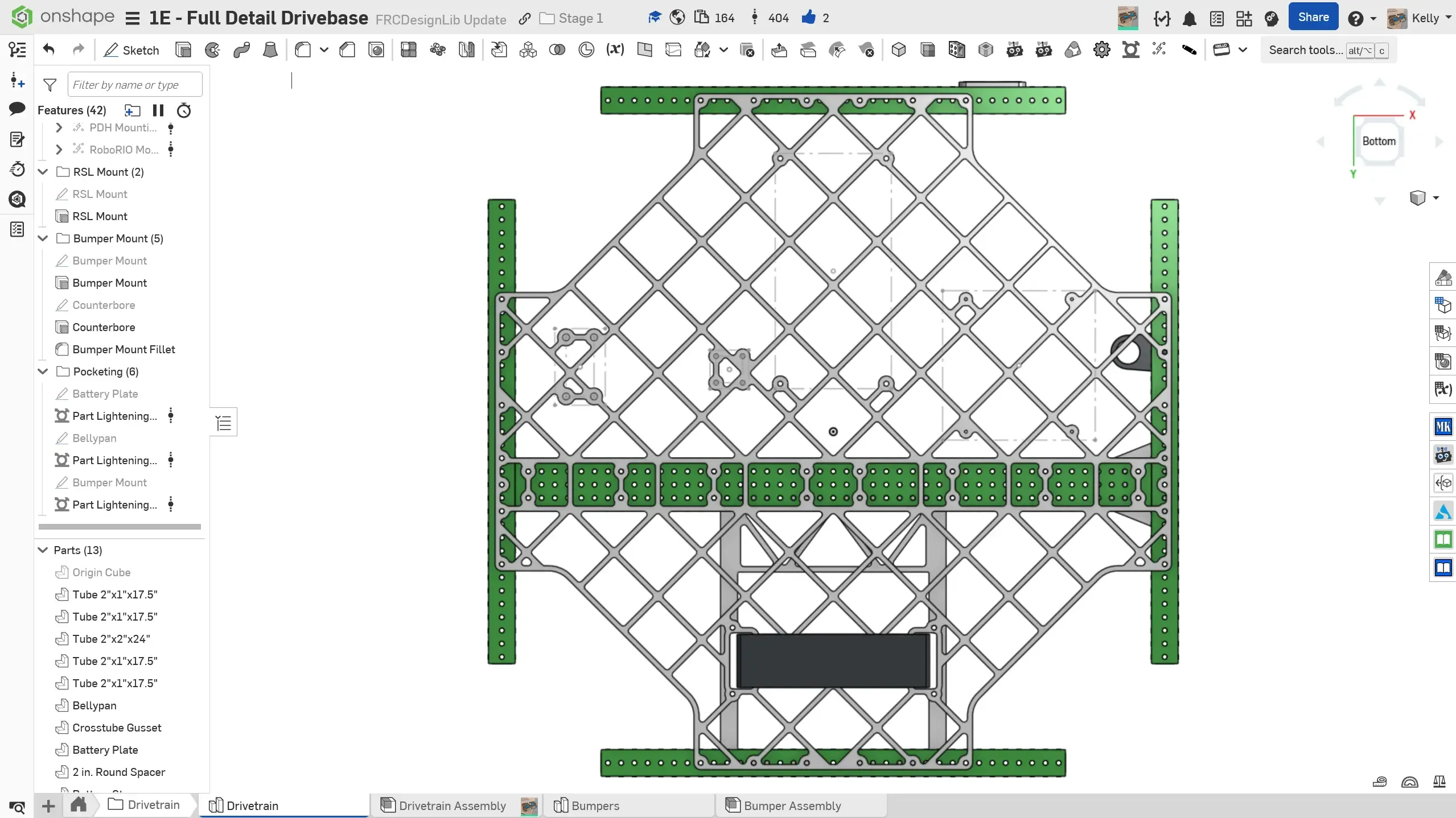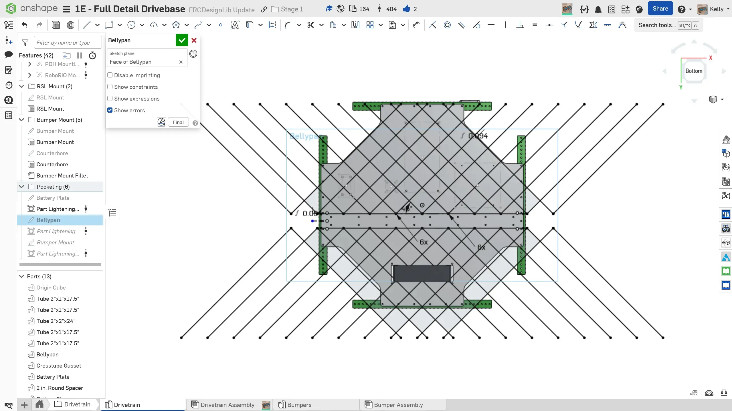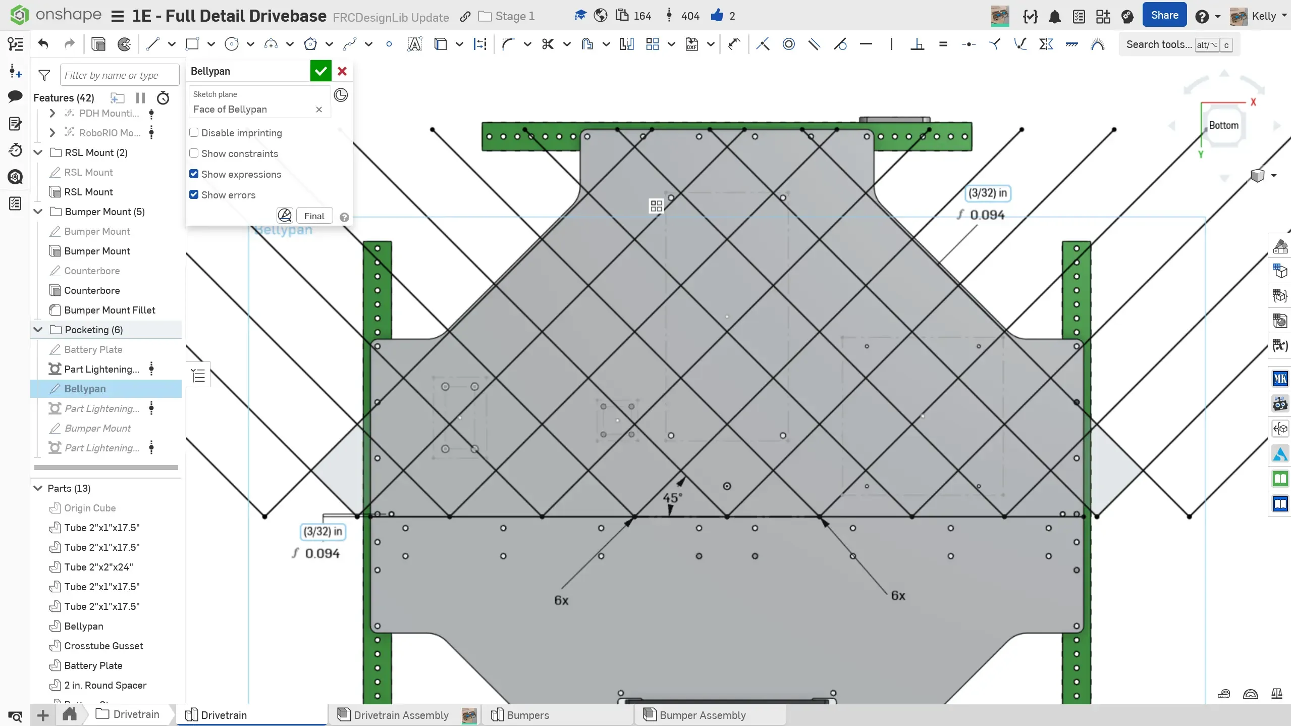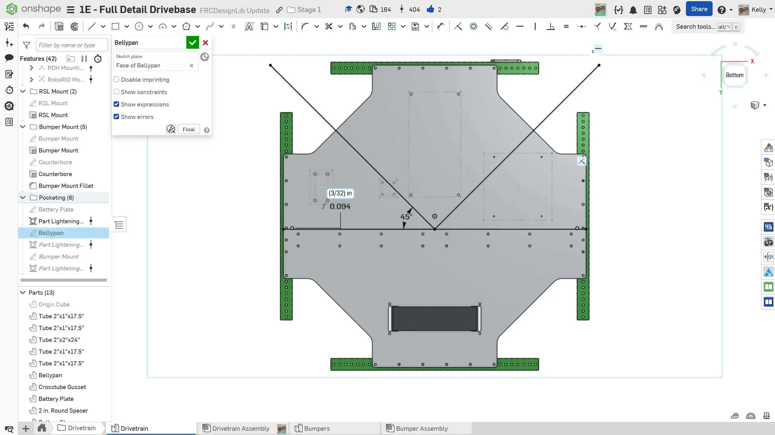 Section titled “Exercise: Bellypan Pocketing”Some teams may choose to pocket their bellypan to reduce weight and make wiring easier. A pocketed bellypan can save around 3-4 lbs. However, this will add significant machining time if you are manufacturing the bellypan yourself or increase cost if you are purchasing the bellypan from a fabrication service (eg: Fabworks). You should carefully consider the tradeoffs with your team.